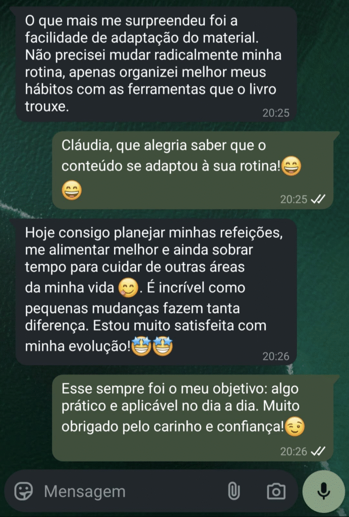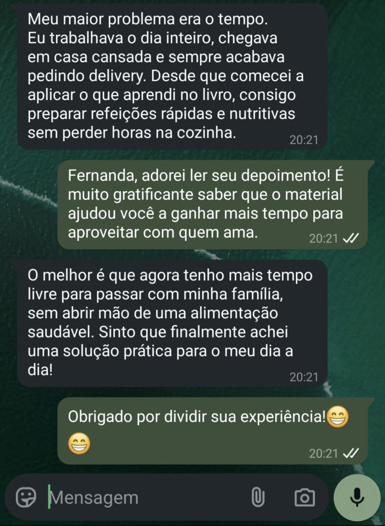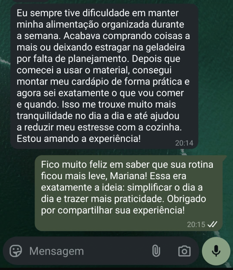 Ao final, você terá autonomia para organizar toda a semana de maneira leve, prática e econômica — e vai perceber que comer bem todos os dias é totalmente possível mesmo que sua vida seja corrida ou você já tenha tentado outros métodos sem sucesso.